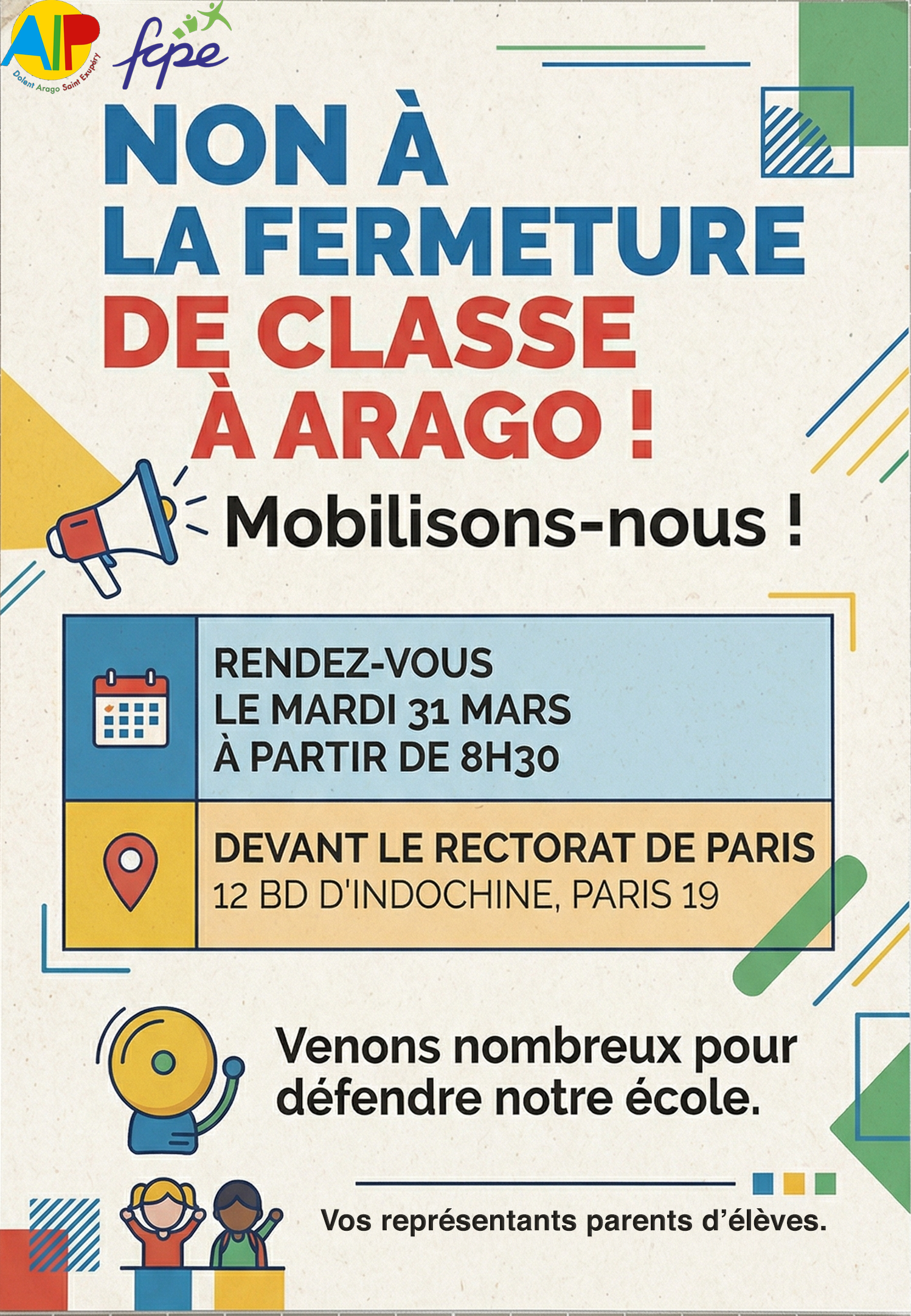 classes se dérouleront dans la journée de mardi 31 mars.Votre école a besoin de vous : banderoles à créer, impressions et distributions de tracts, contact des médias, présence d’un maximum de parents de notre école devant le rectorat.